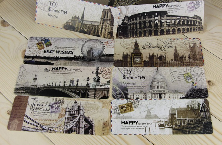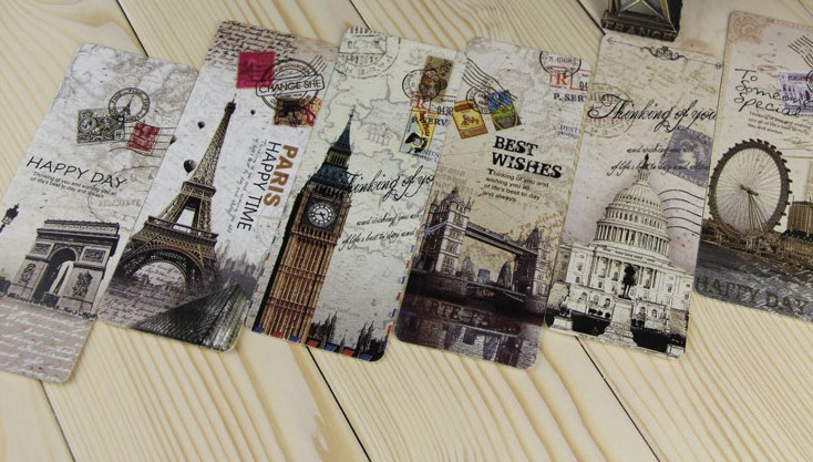 30 pc vintage postcard style bookmarks with world famous tourist attractions, mainly in London and Paris.