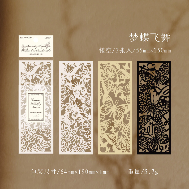 Beautiful and unique hollow-carved paper bookmarks with elegant designs of garden flowers, cat, fish, whale, butterflies, etc.