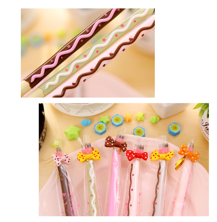 All biscuit stick gel pens are individually wrapped in plastic gift bag with a little bow tied on the top.