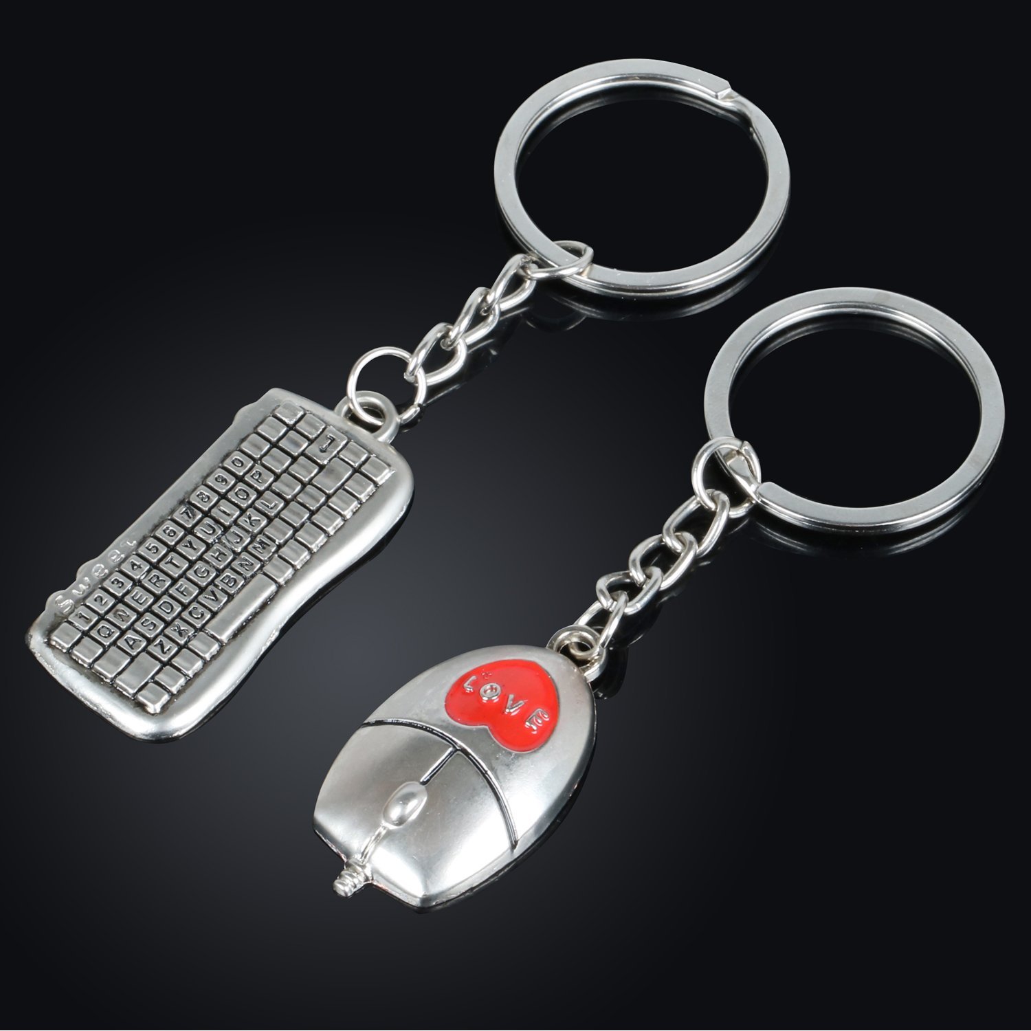 Silver metal couple keyrings / lovers puzzle key chains in keyboard and mouse with red love heart design, are novelty and unique gifts for boyfriend / girlfriend, couples, lovers and partners.