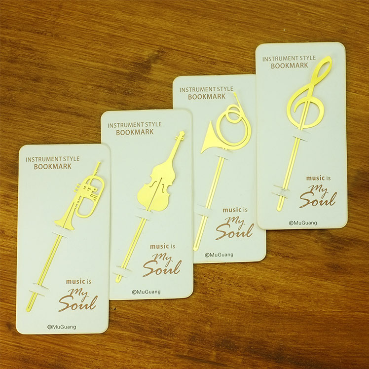 A cute collection of gold colour copper metal bookmarks in the eye-catching designs of musical instruments.