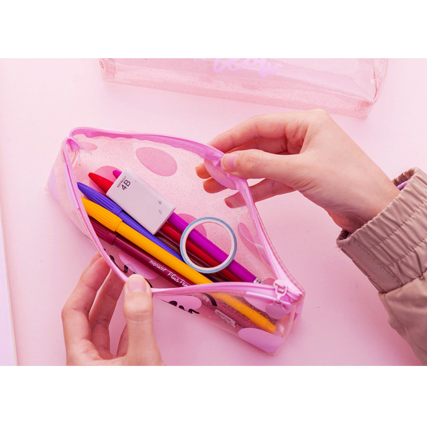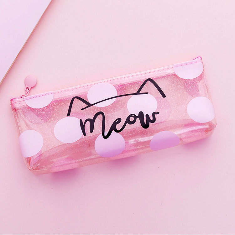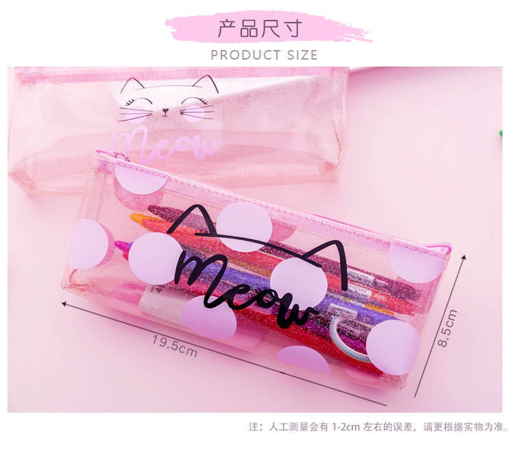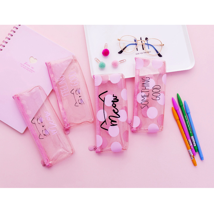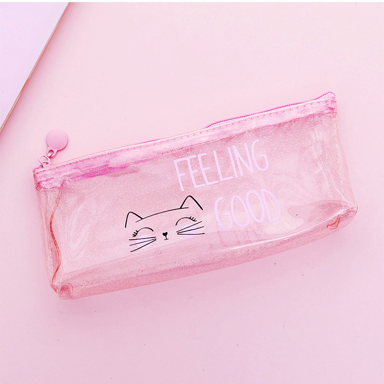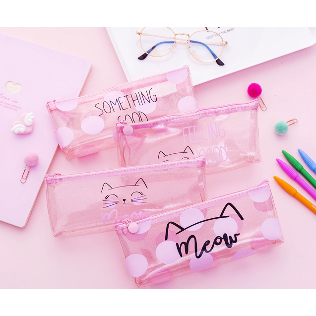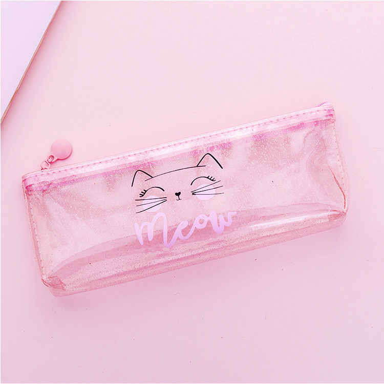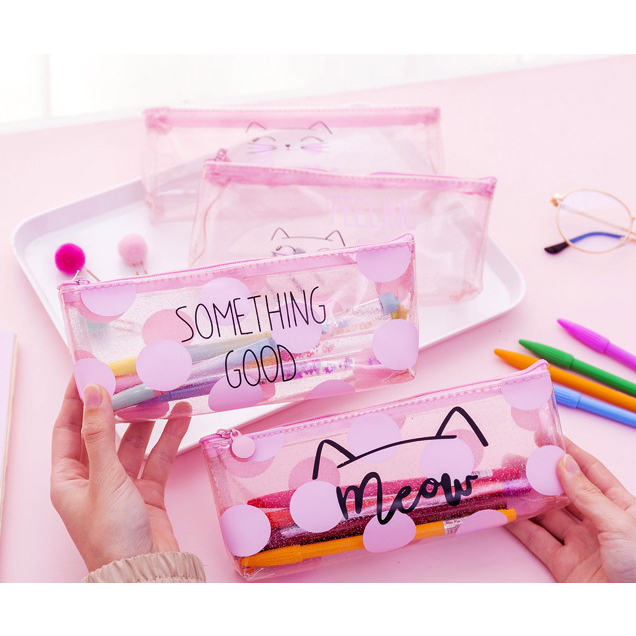 Pink Cat See Through Transparent Pencil Case Girls Cute Cosmetics Makeup Bag