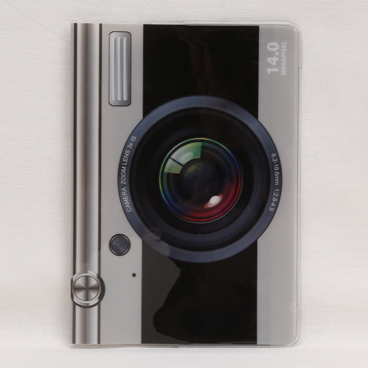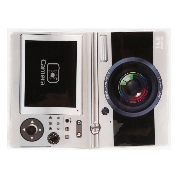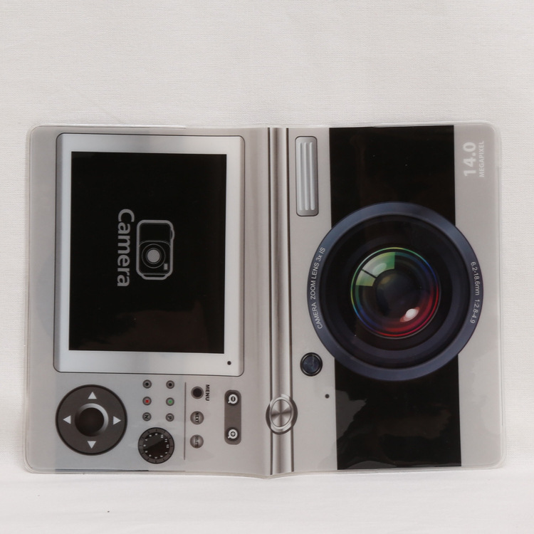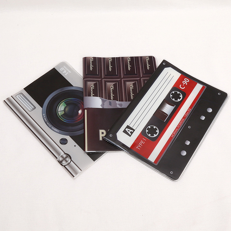 Cute passport cover travel ID holder in the unique designs of digital camera, chocolate bar, and cassette.